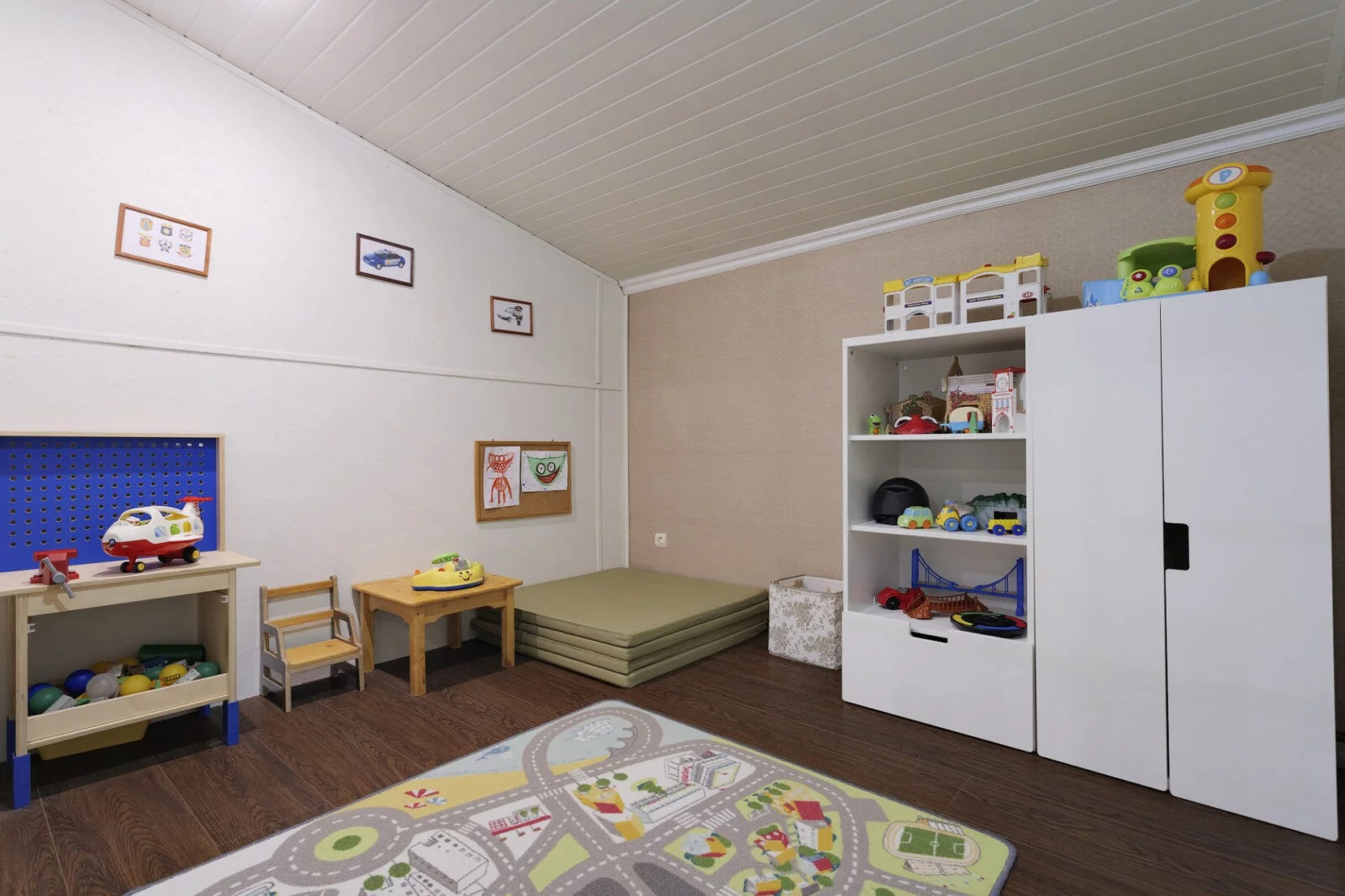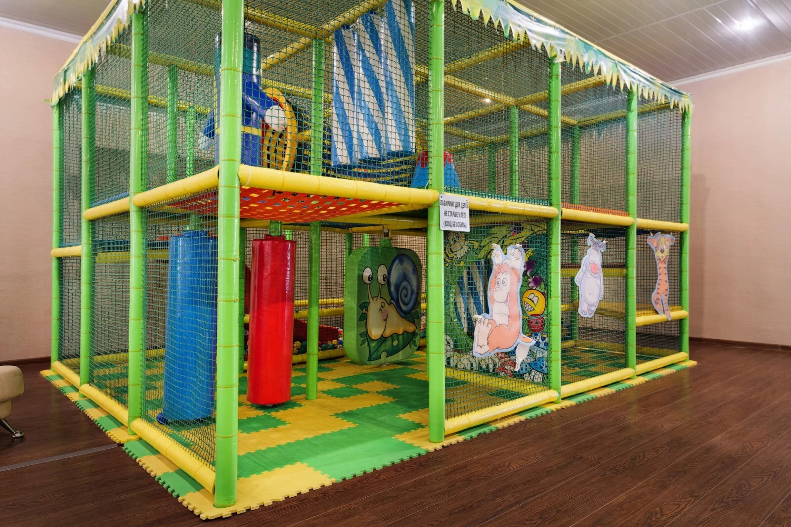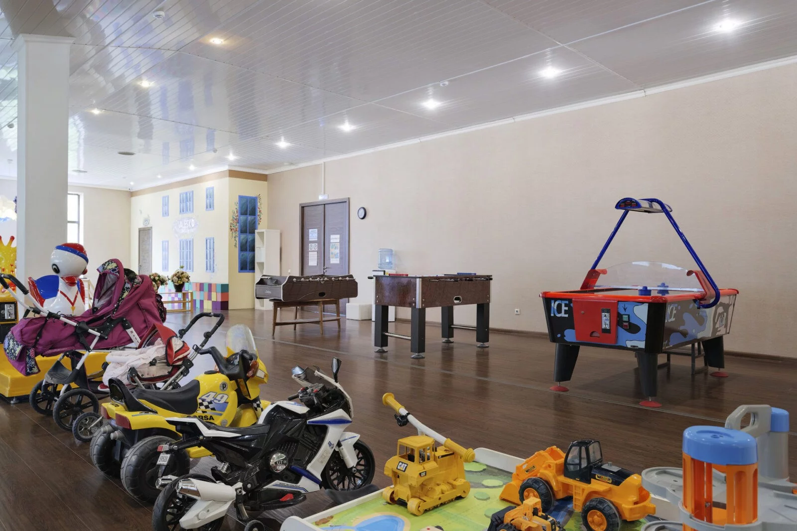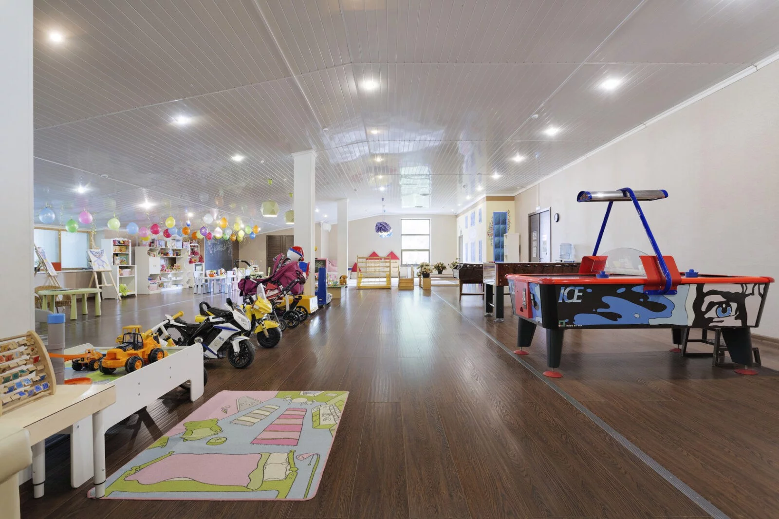 Центральным элементом детской инфраструктуры является игровой центр площадью 356 м² — яркое, просторное пространство с аттракционами, развивающими зонами, настольными играми и мягкими модулями. Здесь дети могут свободно играть, общаться и развивать воображение под присмотром опытных аниматоров. На улице их ждёт современная детская площадка с горками, качелями, лестницами и другими элементами, соответствующими стандартам безопасности. В тёплое время года малыши с удовольствием проводят время у реки, на оборудованном пляже, а зимой — участвуют в снежных забавах и катании на тюбах.